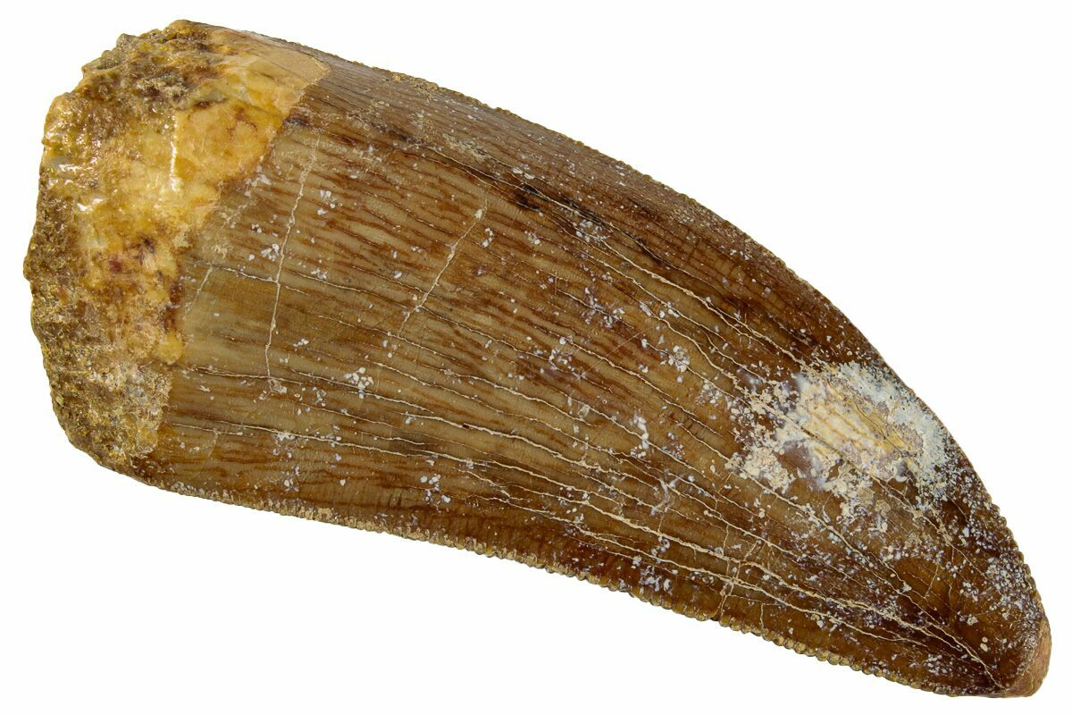 This is a beautiful, serrated, 2.13" long tooth of a sub-adult Carcharodontosaurus from the Late Cretaceous-aged Kem Kem Beds of Morocco. Carcharodontosaurus was a massive predatory dinosaur larger than Tyrannosaurus rex.