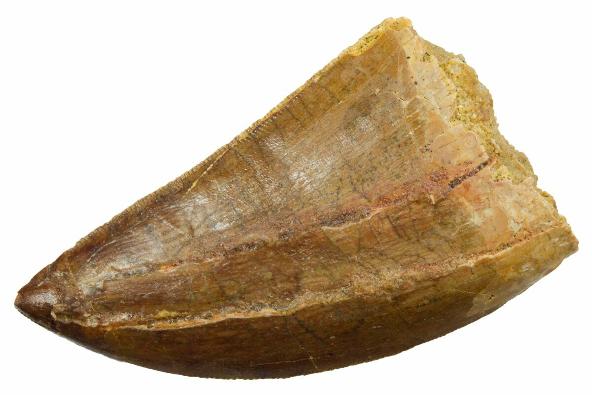This is a serrated, 2.30" long tooth of a sub-adult Carcharodontosaurus from the Late Cretaceous-aged Kem Kem Beds of Morocco. Carcharodontosaurus was a massive predatory dinosaur larger than Tyrannosaurus rex.