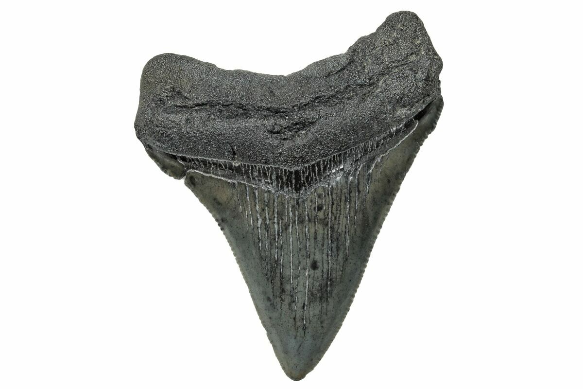 This is a beautiful, sharply serrated, 2.52" long fossil Carcharocles chubutensis shark tooth collected from a river in South Carolina.