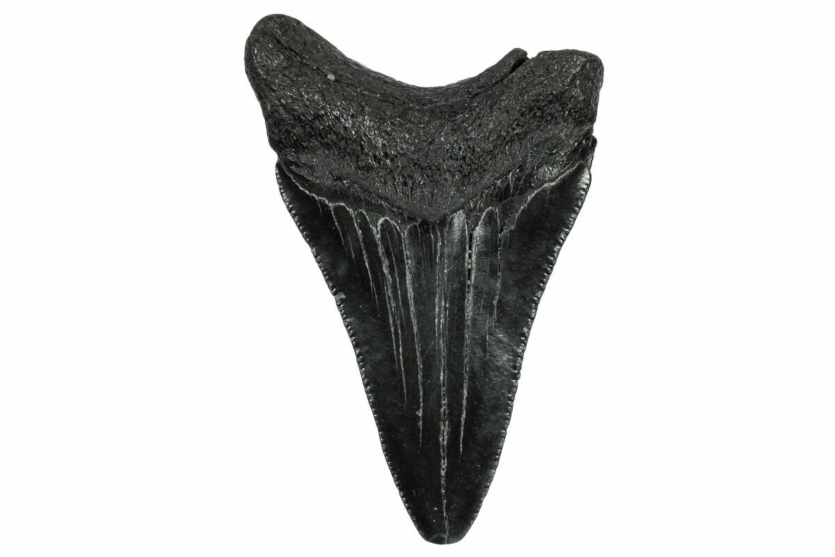 The standard measure for megalodon teeth is slant height, or the longest edge of the tooth. Adult megalodon teeth were typically in the 4 to 5 inch range: teeth over 6 inches are rare and represent super-sized individuals. Only a handful of teeth have ever been found over seven inches.