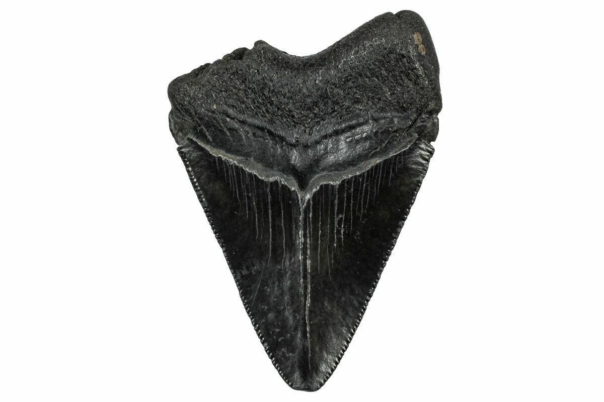 The standard measure for megalodon teeth is slant height, or the longest edge of the tooth. Adult megalodon teeth were typically in the 4 to 5 inch range: teeth over 6 inches are rare and represent super-sized individuals. Only a handful of teeth have ever been found over seven inches.