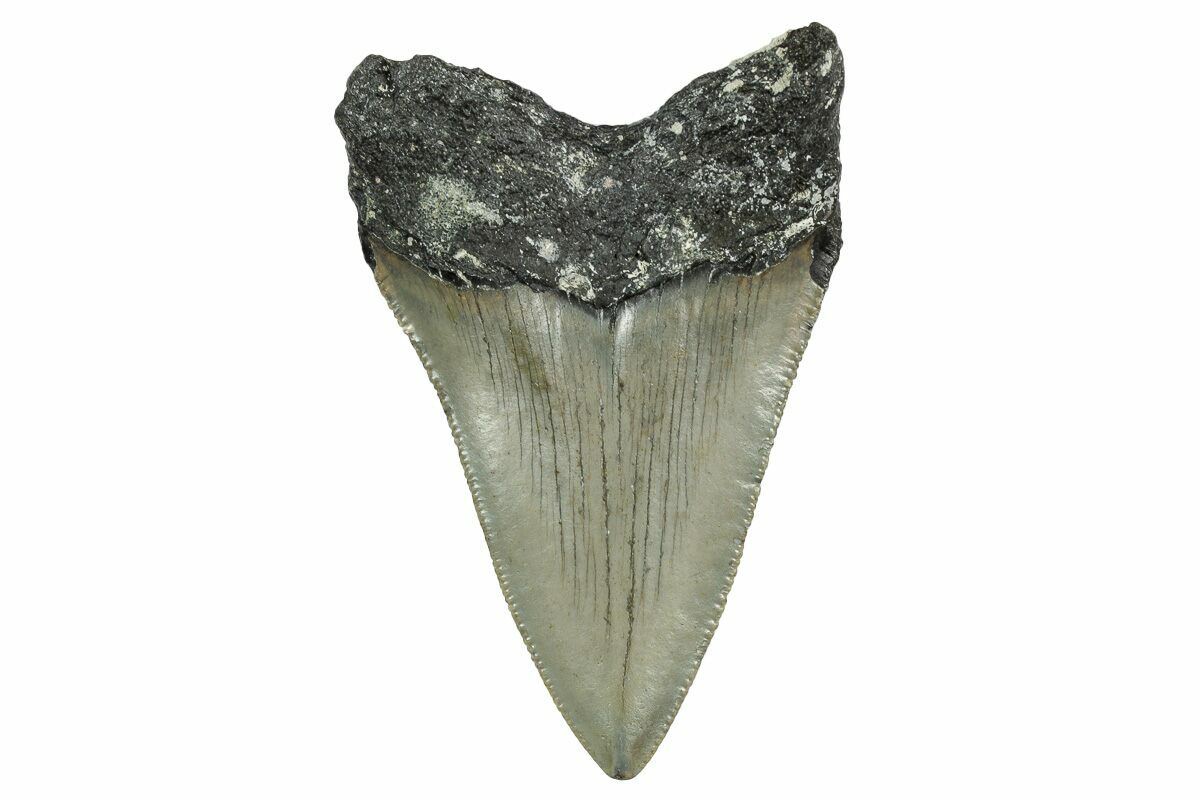 This is a serrated, 3.13" long megalodon tooth collected on the North Carolina coast. It was found by commercial divers collecting "the ledges" in about 100 feet of water. The tooth would have eroded out of the Pungo River Formation when sea levels were lower and the area where these teeth are found was at the shoreline. The fossil tooth itself would be from between 13.8 to 16 million years old. A tooth of this size would have come from a prehistoric, mega-shark in the 30 foot size range.