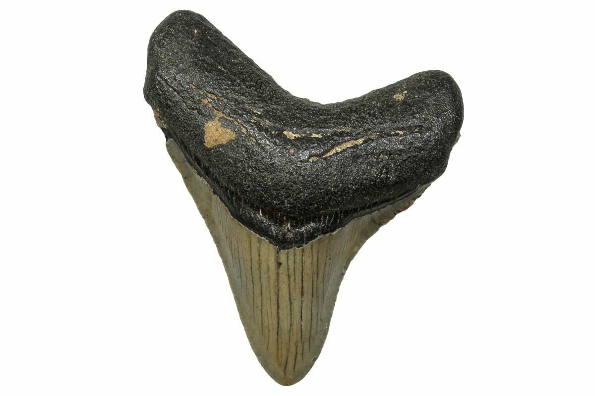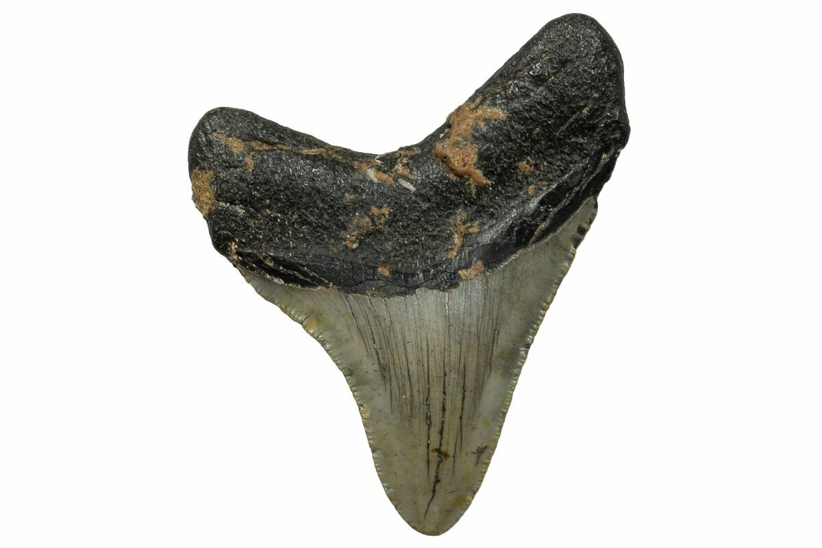 This is a 3.15" long Megalodon tooth collected on the North Carolina coast. It was found by commercial divers collecting "the ledges" in about 100 feet of water. The tooth would have eroded out of the Pungo River Formation when sea levels were lower and the area where these teeth are found was at the shoreline. The fossil tooth itself would be from between 13.8 to 16 million years old. A tooth of this size would have come from a prehistoric, mega-shark in the 25-30 foot size range.