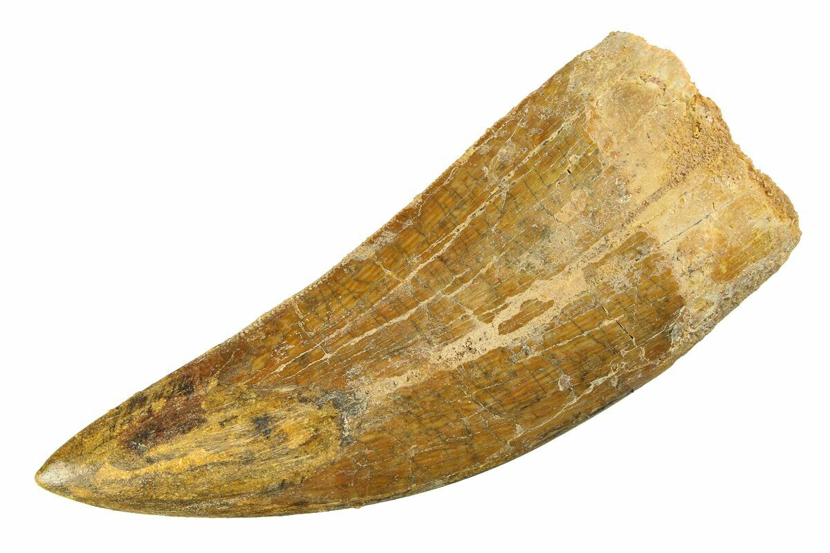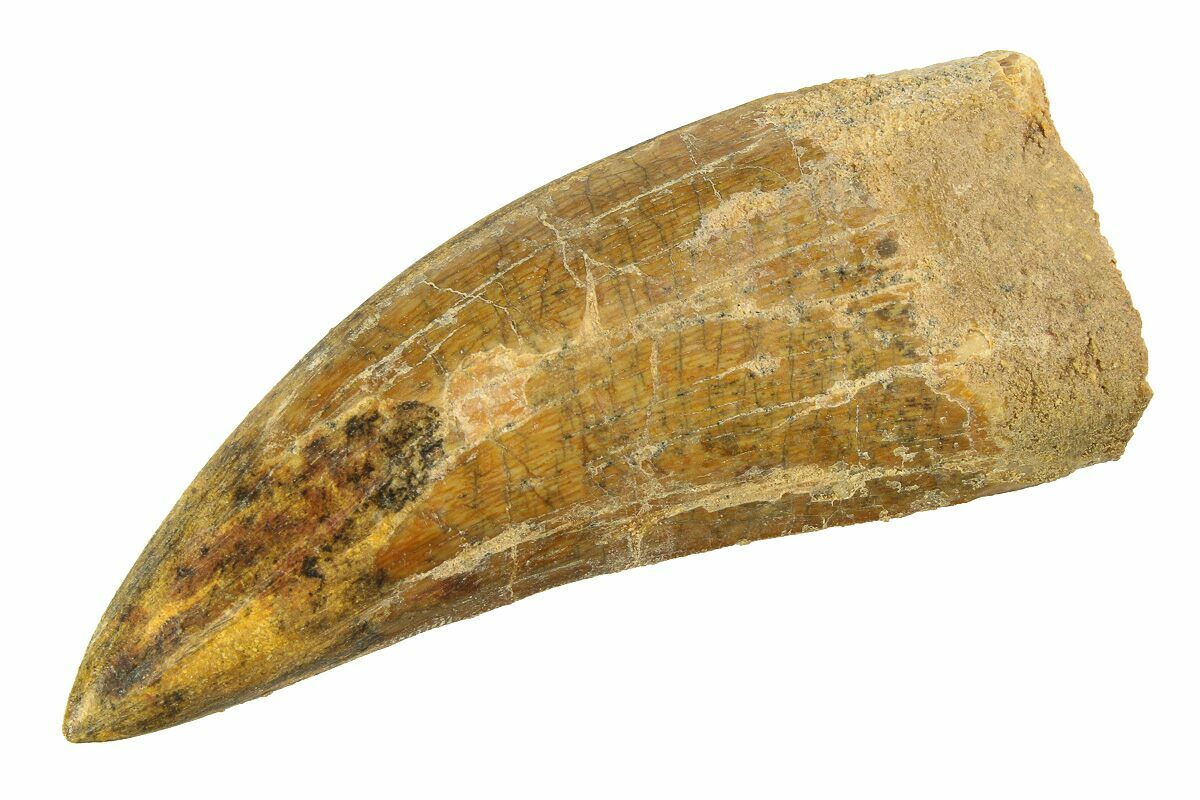 This is a serrated, 3.26" long tooth of Carcharodontosaurus, collected from the Late Cretaceous-aged Kem Kem Beds of Morocco. Carcharodontosaurus was a massive predatory dinosaur larger than Tyrannosaurus rex.