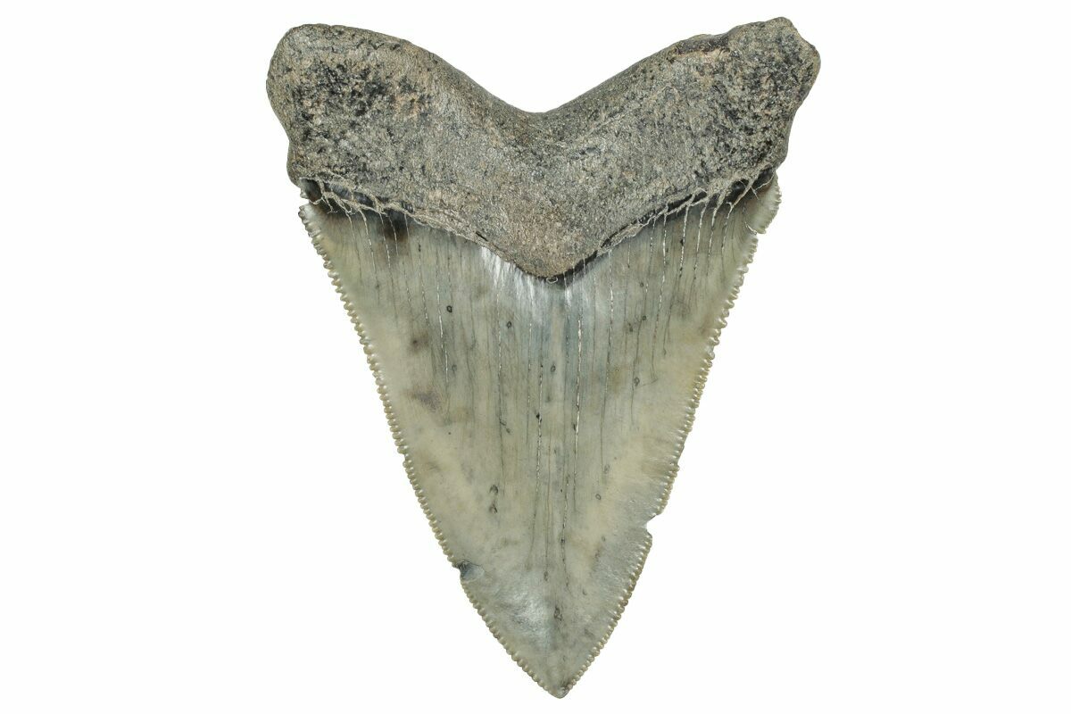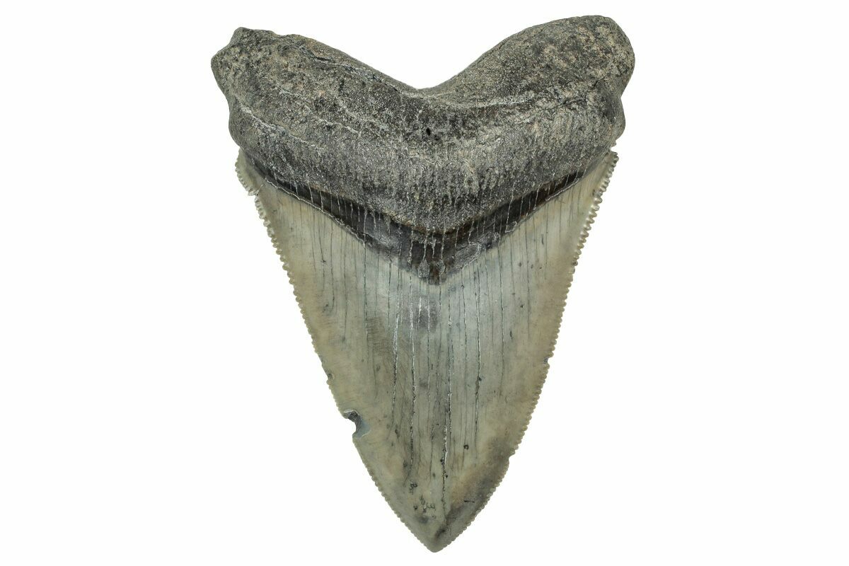 This is a sharply serrated, 3.28" long fossil megalodon tooth collected from a river in South Carolina. The tooth would have come from a prehistoric mega-shark in the 30 foot size range.
