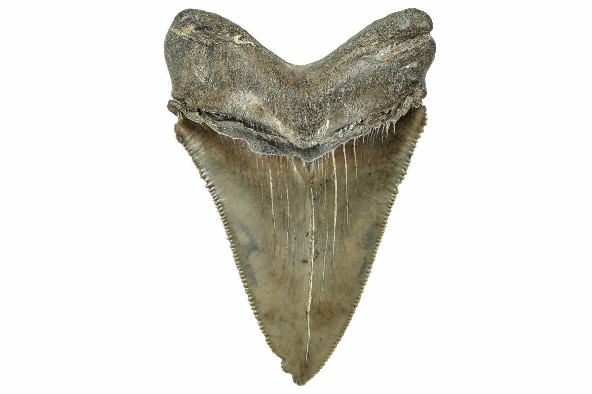 This is a serrated, 3.32" long fossil megalodon tooth collected from a river in South Carolina. The tooth would have come from a prehistoric mega-shark in the 30 foot size range.