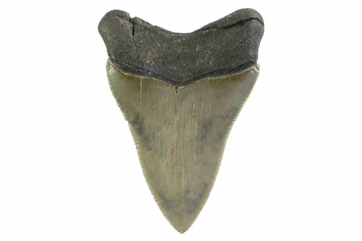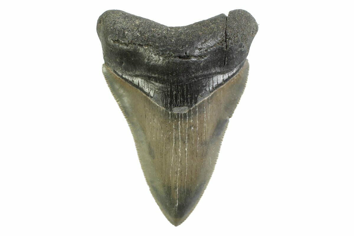 This is a serrated, 3.34" long fossil megalodon tooth collected from the Savannah River area along the border of Georgia and South Carolina. The tooth would have come from a prehistoric mega-shark in the 30 foot size range.