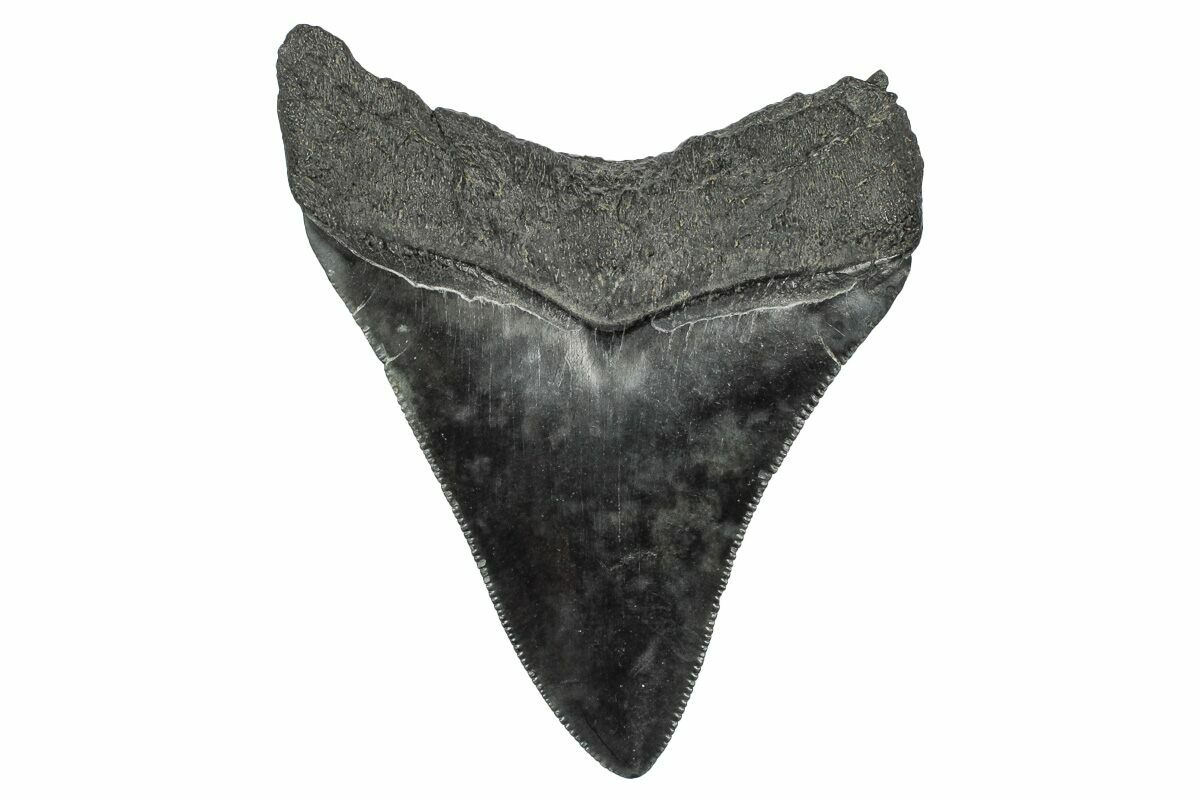 This is a serrated, 3.34" long fossil megalodon tooth collected in South Carolina. A tooth of this size would have come from a prehistoric mega-shark in the 35+ foot size range.