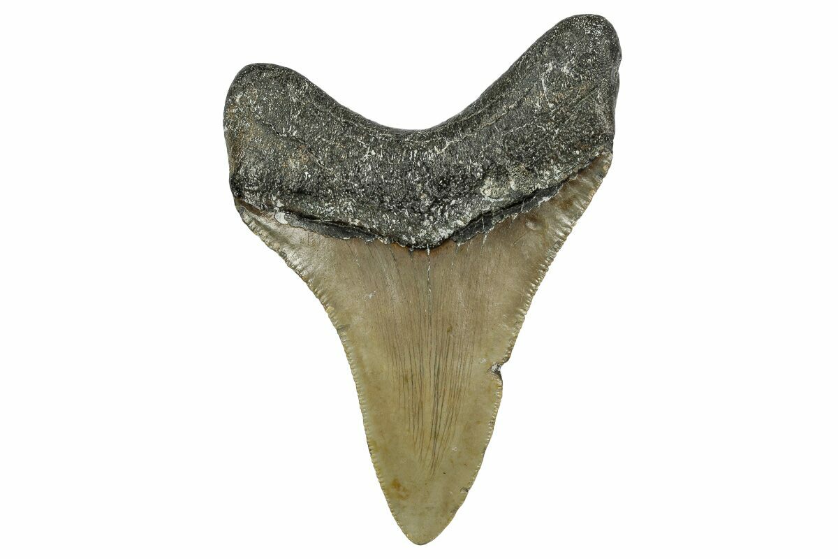 This is a serrated, 3.44" long megalodon tooth collected on the North Carolina coast. It was found by commercial divers collecting "the ledges" in about 100 feet of water. The tooth would have eroded out of the Pungo River Formation when sea levels were lower and the area where these teeth are found was at the shoreline. The fossil tooth itself would be from between 13.8 to 16 million years old. A tooth of this size would have come from a prehistoric, mega-shark in the 30 foot size range.