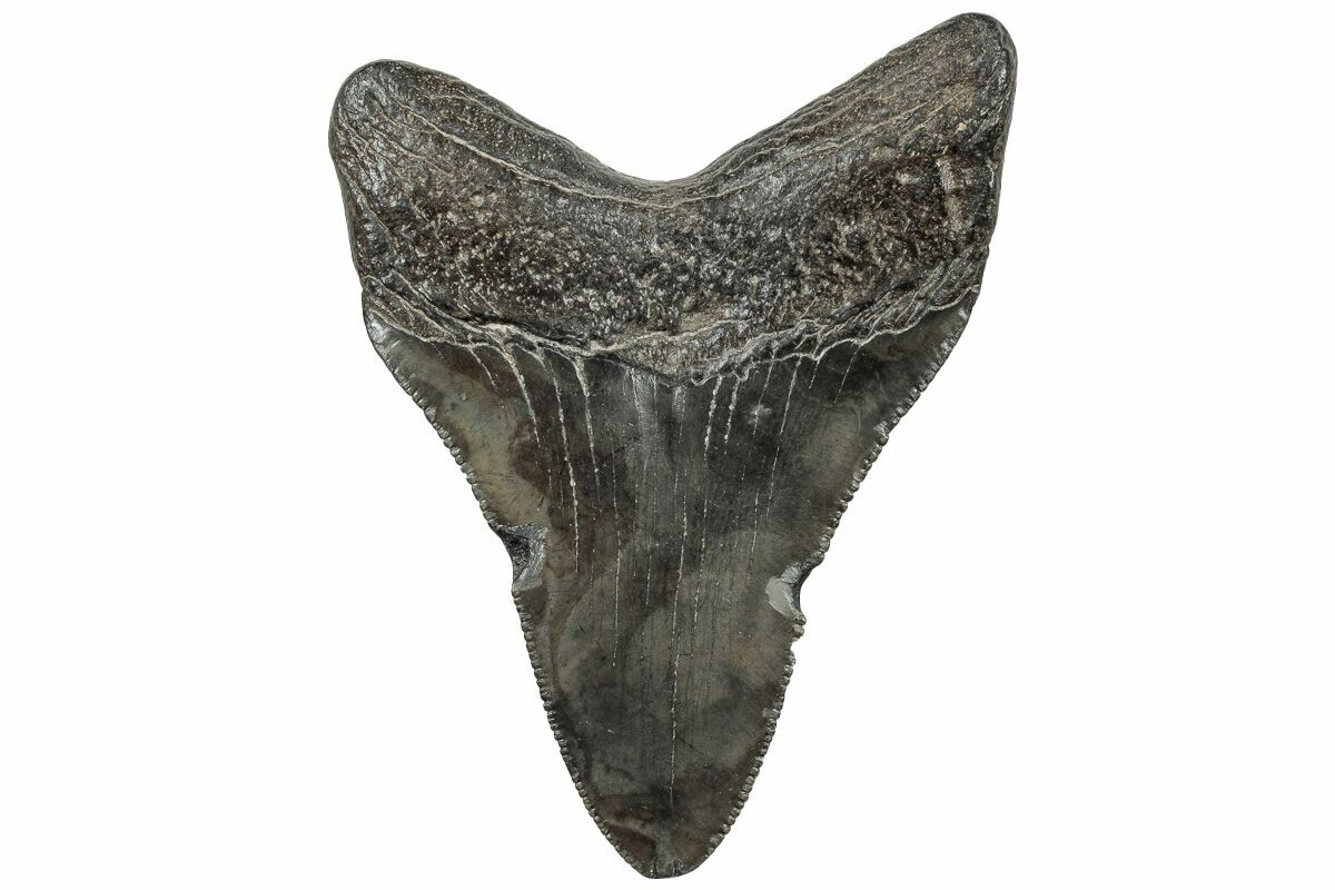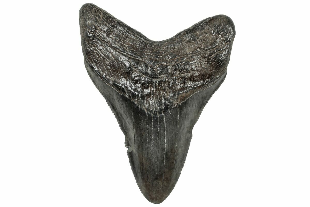 This is a serrated, 3.46" long fossil megalodon tooth collected from a river in South Carolina. The tooth would have come from a prehistoric mega-shark in the 30 foot size range.