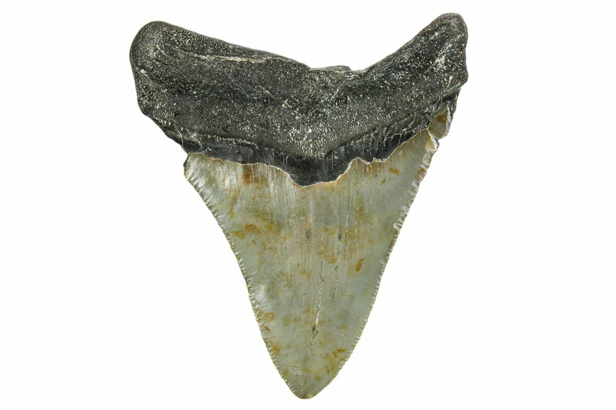 This is a serrated, 3.48" long megalodon tooth collected on the North Carolina coast. It was found by commercial divers collecting "the ledges" in about 100 feet of water. The tooth would have eroded out of the Pungo River Formation when sea levels were lower and the area where these teeth are found was at the shoreline. The fossil tooth itself would be from between 13.8 to 16 million years old. A tooth of this size would have come from a prehistoric, mega-shark in the 30 foot size range.