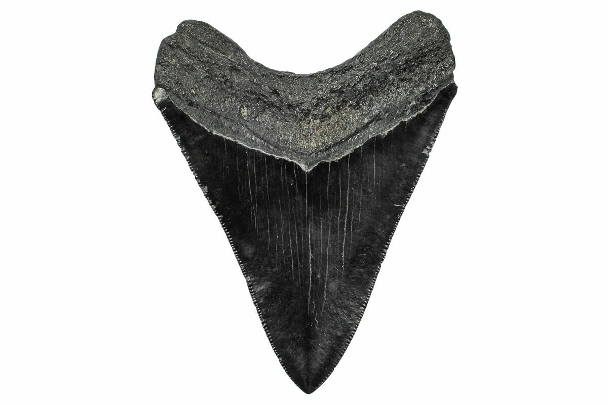 The standard measure for megalodon teeth is slant height, or the longest edge of the tooth. Adult megalodon teeth were typically in the 4 to 5 inch range: teeth over 6 inches are rare and represent super-sized individuals. Only a handful of teeth have ever been found over seven inches.