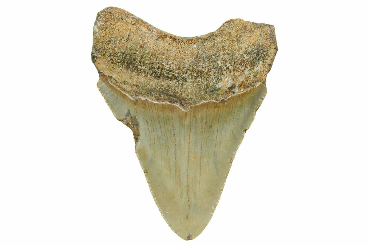 This is a serrated, 3.54" long megalodon tooth collected on the North Carolina coast. It was found by commercial divers collecting "the ledges" in about 100 feet of water. The tooth would have eroded out of the Pungo River Formation when sea levels were lower and the area where these teeth are found was at the shoreline. The fossil tooth itself would be from between 13.8 to 16 million years old. A tooth of this size would have come from a prehistoric, mega-shark in the 30 foot size range.