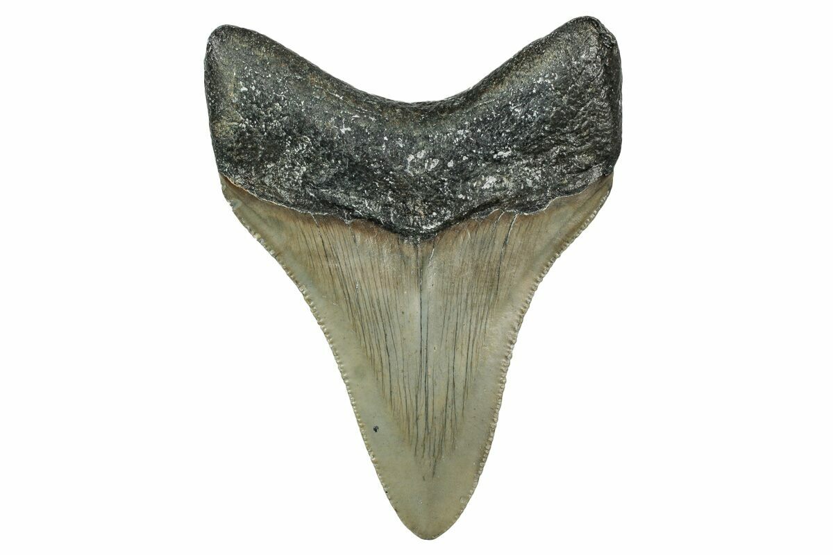This is a serrated, 3.12" long megalodon tooth collected on the North Carolina coast. It was found by commercial divers collecting "the ledges" in about 100 feet of water. The tooth would have eroded out of the Pungo River Formation when sea levels were lower and the area where these teeth are found was at the shoreline. The fossil tooth itself would be from between 13.8 to 16 million years old. A tooth of this size would have come from a prehistoric, mega-shark in the 30 foot size range.