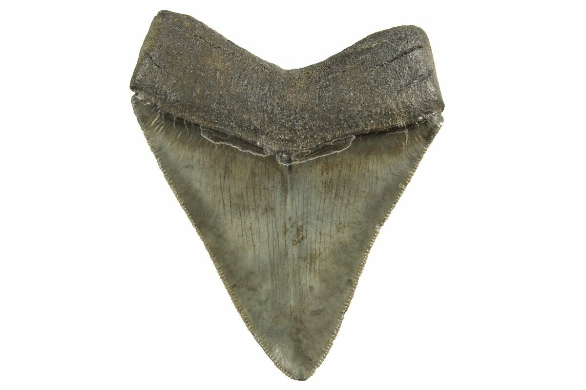 This is a serrated, 3.72" long fossil megalodon tooth collected from a river in South Carolina. The tooth would have come from a prehistoric mega-shark in the 30 foot size range.