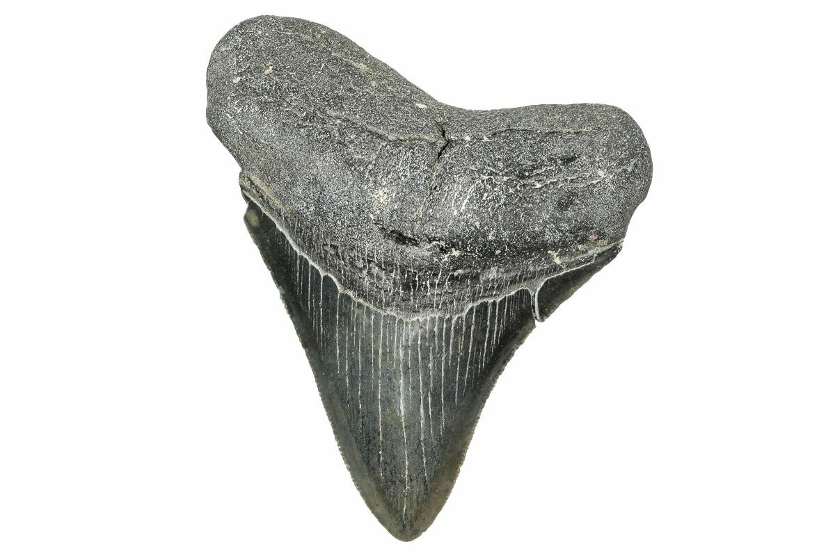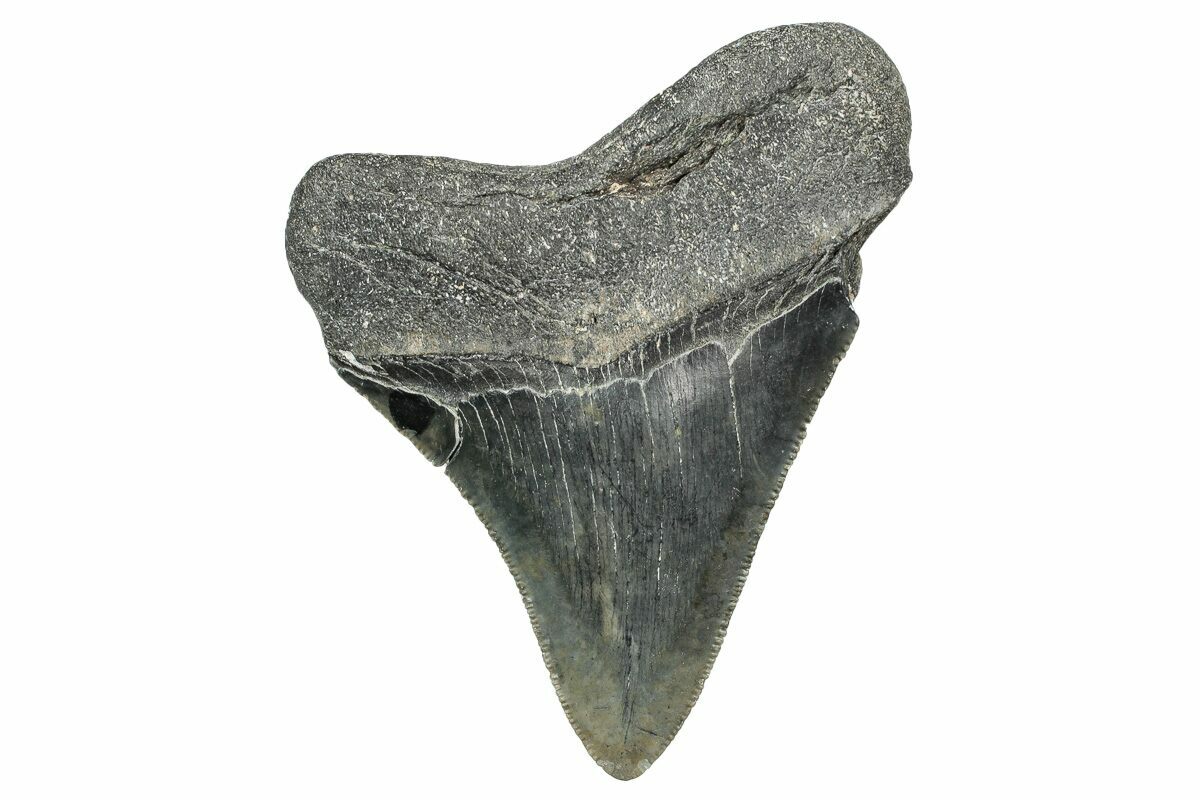 This is a serrated, 3.73" long megalodon tooth collected on the North Carolina coast. It was found by commercial divers collecting "the ledges" in about 100 feet of water. The tooth would have eroded out of the Pungo River Formation when sea levels were lower and the area where these teeth are found was at the shoreline. The fossil tooth itself would be from between 13.8 to 16 million years old. A tooth of this size would have come from a prehistoric, mega-shark in the 30 foot size range.