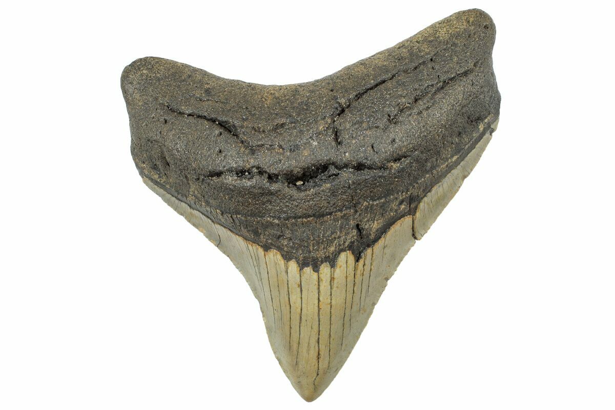 This is a 3.77" long megalodon tooth collected on the North Carolina coast. It was found by commercial divers collecting "the ledges" in about 100 feet of water. The tooth would have eroded out of the Pungo River Formation when sea levels were lower and the area where these teeth are found was at the shoreline. The fossil tooth itself would be between 13.8 to 16 million years old. A tooth of this size would have come from a prehistoric, mega-shark in the 30 foot size range.
