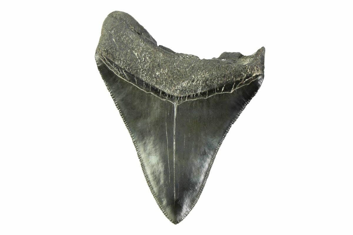 The standard measure for megalodon teeth is slant height, or the longest edge of the tooth. Adult megalodon teeth were typically in the 4 to 5 inch range: teeth over 6 inches are rare and represent super-sized individuals. Only a handful of teeth have ever been found over seven inches.