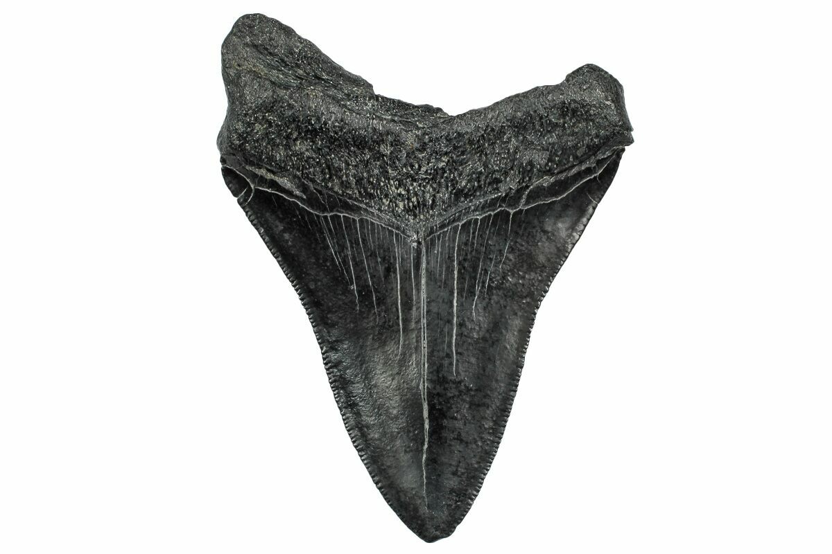 The standard measure for megalodon teeth is slant height, or the longest edge of the tooth. Adult megalodon teeth were typically in the 4 to 5 inch range: teeth over 6 inches are rare and represent super-sized individuals. Only a handful of teeth have ever been found over seven inches.