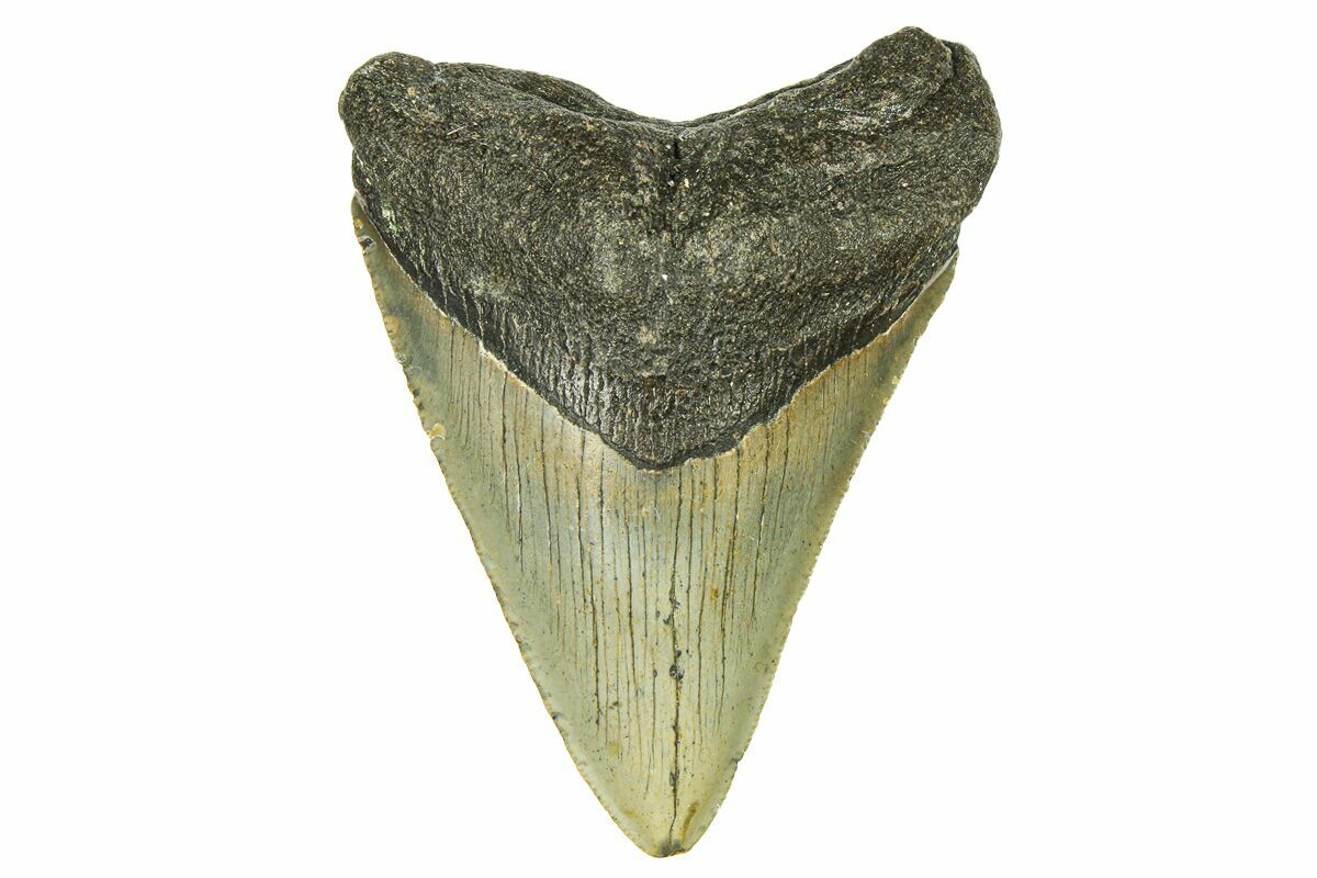 This is a serrated, 3.81" long megalodon tooth collected on the North Carolina coast. It was found by commercial divers collecting "the ledges" in about 100 feet of water. The tooth would have eroded out of the Pungo River Formation when sea levels were lower and the area where these teeth are found was at the shoreline. The fossil tooth itself would be from between 13.8 to 16 million years old. A tooth of this size would have come from a prehistoric, mega-shark in the 25-30 foot size range.