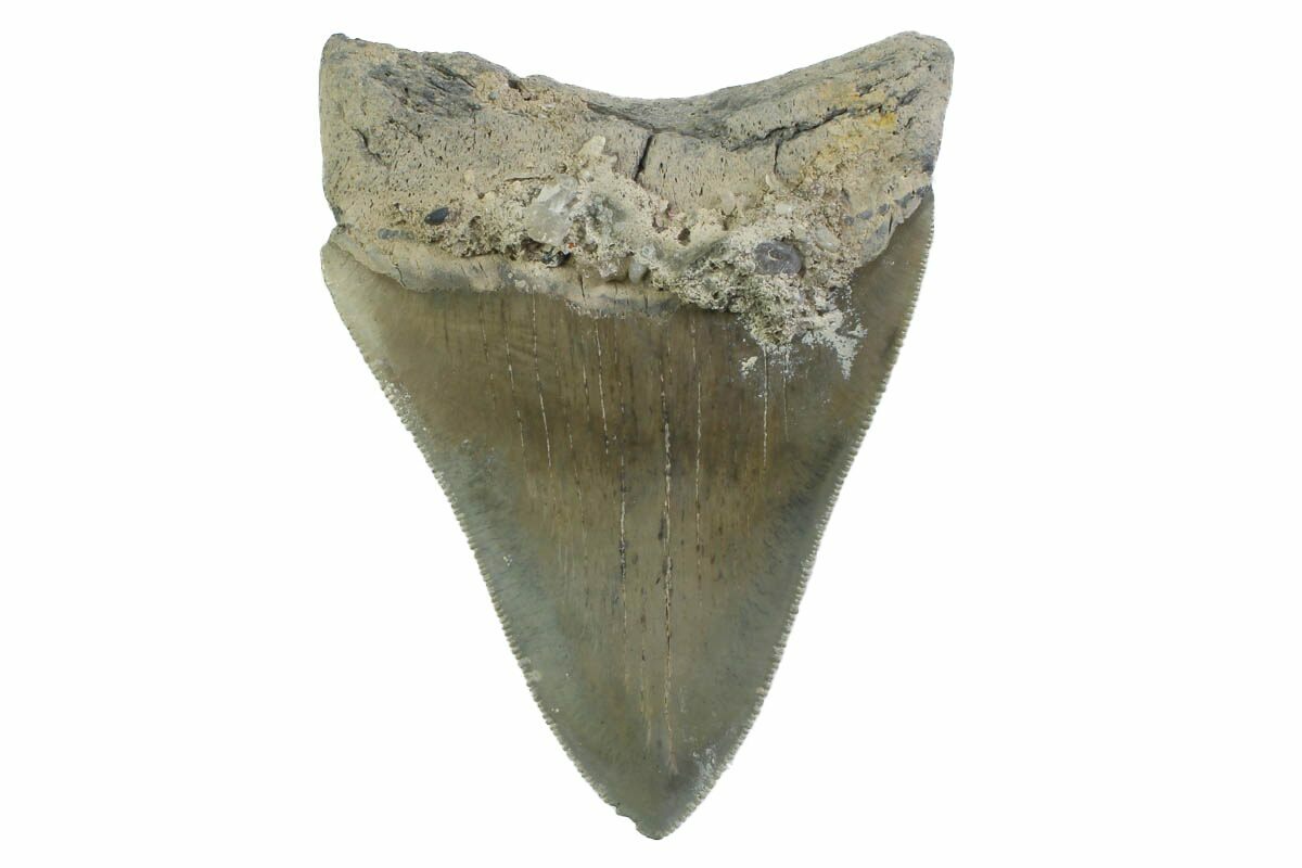 The standard measure for megalodon teeth is slant height, or the longest edge of the tooth. Adult megalodon teeth were typically in the 4 to 5 inch range: teeth over 6 inches are rare and represent super-sized individuals. Only a handful of teeth have ever been found over seven inches.