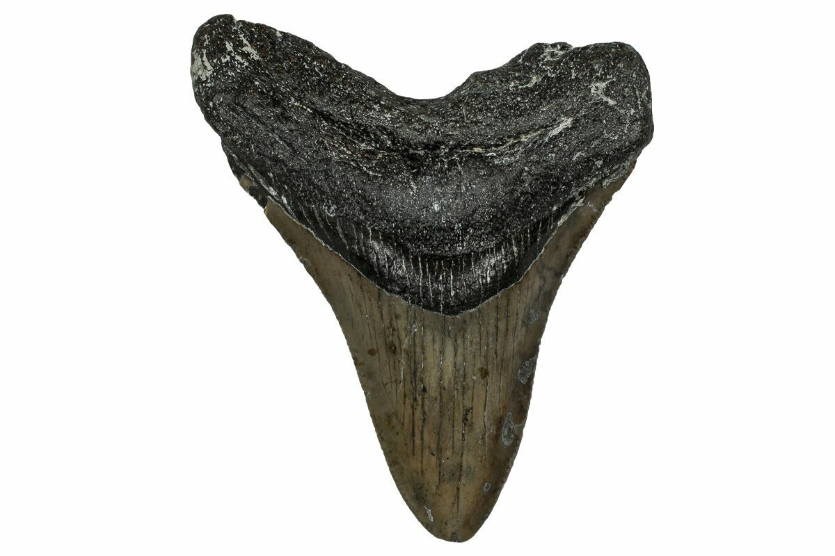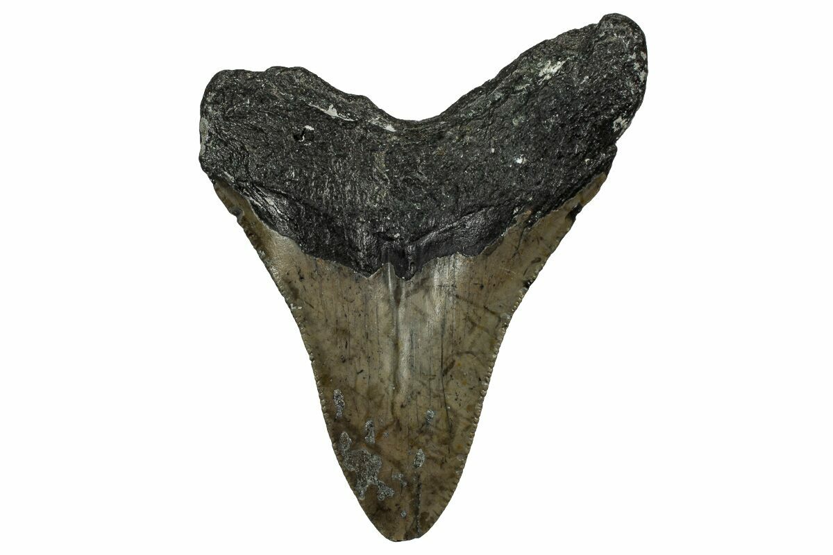 This is a serrated, 3.86" long megalodon tooth collected on the North Carolina coast. It was found by commercial divers collecting "the ledges" in about 100 feet of water. The tooth would have eroded out of the Pungo River Formation when sea levels were lower and the area where these teeth are found was at the shoreline. The fossil tooth itself would be from between 13.8 to 16 million years old. A tooth of this size would have come from a prehistoric, mega-shark in the 30 foot size range.