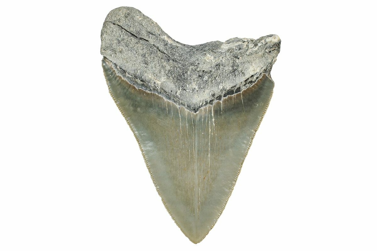 This is a serrated, 3.86" long megalodon tooth collected on the North Carolina coast. It was found by commercial divers collecting "the ledges" in about 100 feet of water. The tooth would have eroded out of the Pungo River Formation when sea levels were lower and the area where these teeth are found was at the shoreline. The fossil tooth itself would be from between 13.8 to 16 million years old. A tooth of this size would have come from a prehistoric, mega-shark in the 30 foot size range.