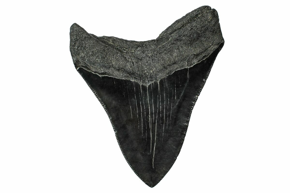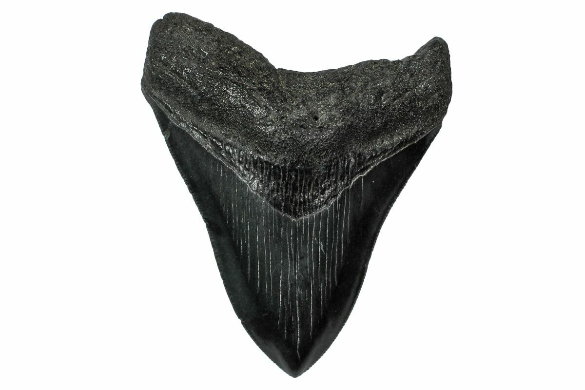 The standard measure for megalodon teeth is slant height, or the longest edge of the tooth. Adult megalodon teeth were typically in the 4 to 5 inch range: teeth over 6 inches are rare and represent super-sized individuals. Only a handful of teeth have ever been found over seven inches.