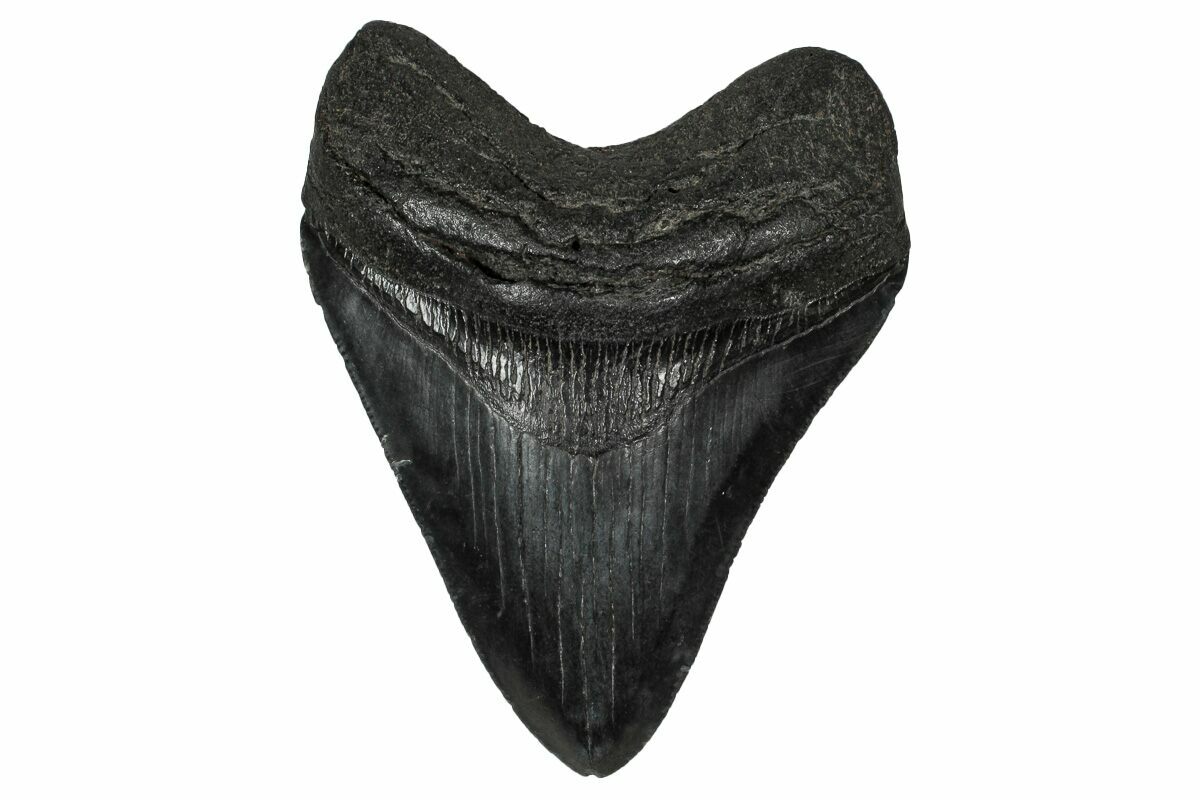 The standard measure for megalodon teeth is slant height, or the longest edge of the tooth. Adult megalodon teeth were typically in the 4 to 5 inch range: teeth over 6 inches are rare and represent super-sized individuals. Only a handful of teeth have ever been found over seven inches.