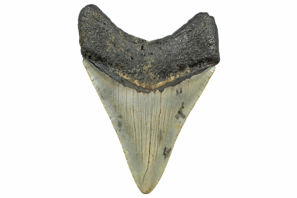 This is a serrated, 3.92" long megalodon tooth collected on the North Carolina coast. It was found by commercial divers collecting "the ledges" in about 100 feet of water. The tooth would have eroded out of the Pungo River Formation when sea levels were lower and the area where these teeth are found was at the shoreline. The fossil tooth itself would be from between 13.8 to 16 million years old. A tooth of this size would have come from a prehistoric, mega-shark in the 30 foot size range.