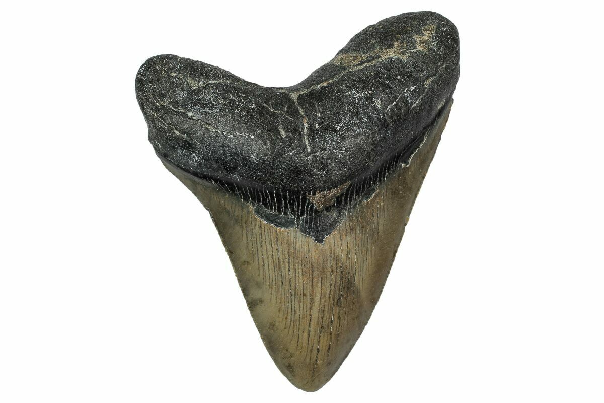 This is a serrated, 3.92" long megalodon tooth collected on the North Carolina coast. It was found by commercial divers collecting "the ledges" in about 100 feet of water. The tooth would have eroded out of the Pungo River Formation when sea levels were lower and the area where these teeth are found was at the shoreline. The fossil tooth itself would be from between 13.8 to 16 million years old. A tooth of this size would have come from a prehistoric, mega-shark in the 30 foot size range.