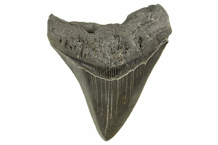 This is a serrated, 3.93" long fossil megalodon tooth collected from a river in South Carolina. The tooth would have come from a prehistoric mega-shark in the 30 foot size range.