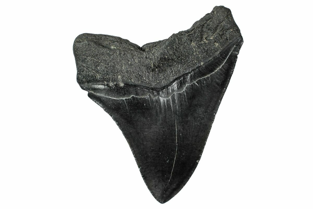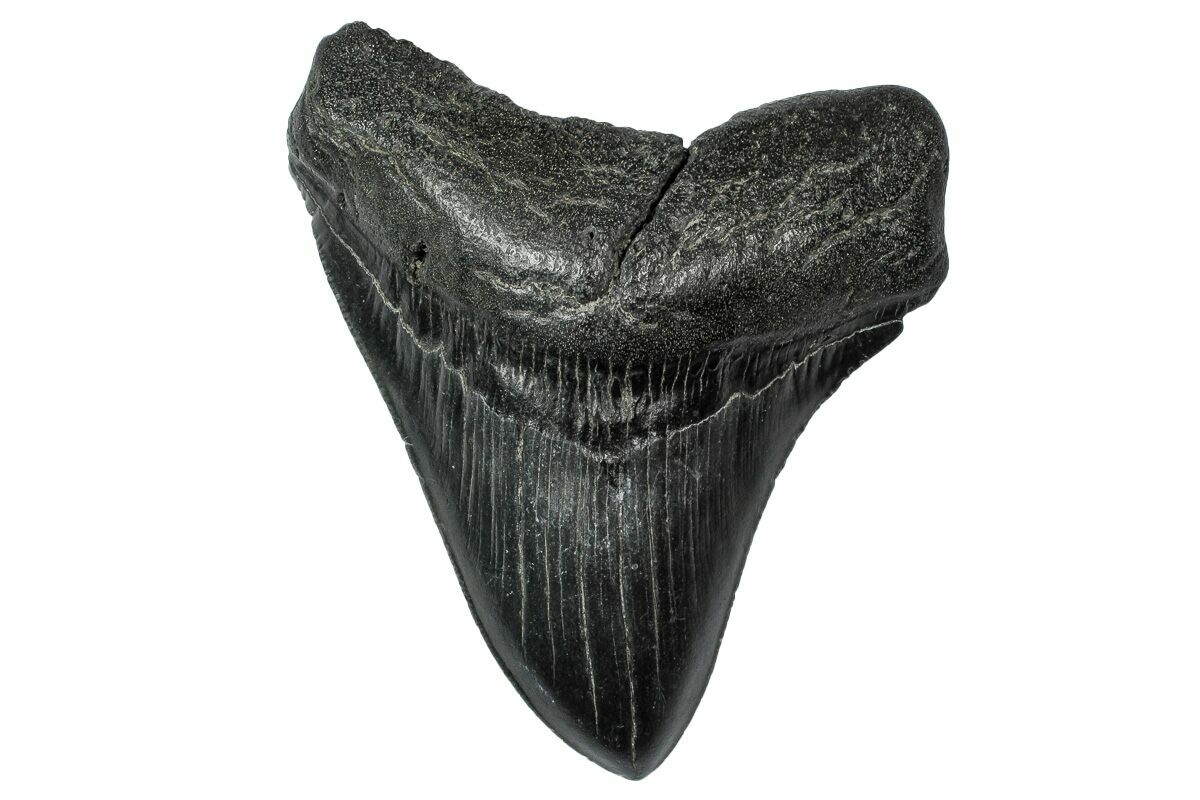 The standard measure for megalodon teeth is slant height, or the longest edge of the tooth. Adult megalodon teeth were typically in the 4 to 5 inch range: teeth over 6 inches are rare and represent super-sized individuals. Only a handful of teeth have ever been found over seven inches.
