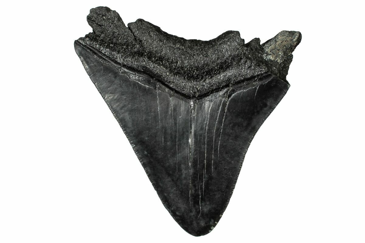 The standard measure for megalodon teeth is slant height, or the longest edge of the tooth. Adult megalodon teeth were typically in the 4 to 5 inch range: teeth over 6 inches are rare and represent super-sized individuals. Only a handful of teeth have ever been found over seven inches.