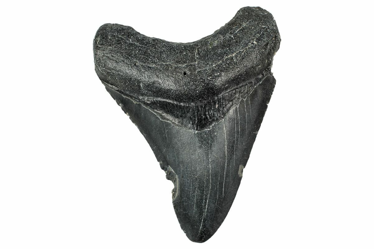 This is a 3.98" long megalodon tooth collected on the North Carolina coast. It was found by commercial divers collecting "the ledges" in about 100 feet of water. The tooth would have eroded out of the Pungo River Formation when sea levels were lower and the area where these teeth are found was at the shoreline. The fossil tooth itself would be from between 13.8 to 16 million years old. A tooth of this size would have come from a prehistoric, mega-shark in the 30 foot size range.