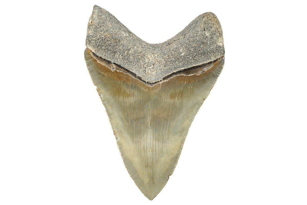 This is a serrated, 3.98" long Megalodon tooth collected on the North Carolina coast. It was found by commercial divers collecting "the ledges" in about 100 feet of water. The tooth would have eroded out of the Pungo River Formation when sea levels were lower and the area where these teeth are found was at the shoreline. The fossil tooth itself would be from between 13.8 to 16 million years old. A tooth of this size would have come from a prehistoric, mega-shark in the 30 foot size range.