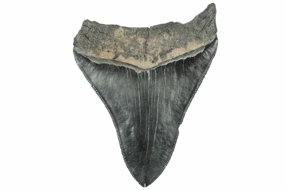Serrated, 3.99" Fossil Megalodon Tooth - South Carolina