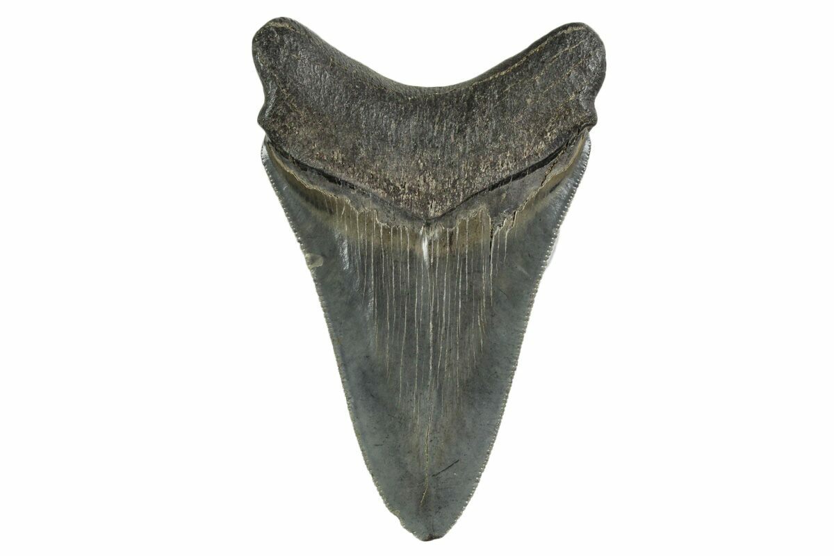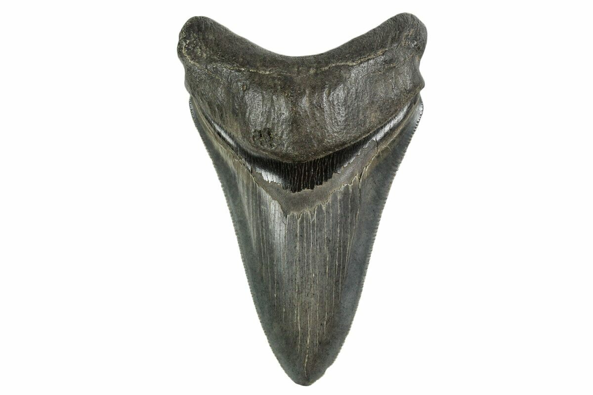 This is a 4.01" long fossil megalodon tooth collected from the Savannah River area along the border of Georgia and South Carolina. The tooth would have come from an adult, prehistoric, mega-shark in the 35+ foot size range.