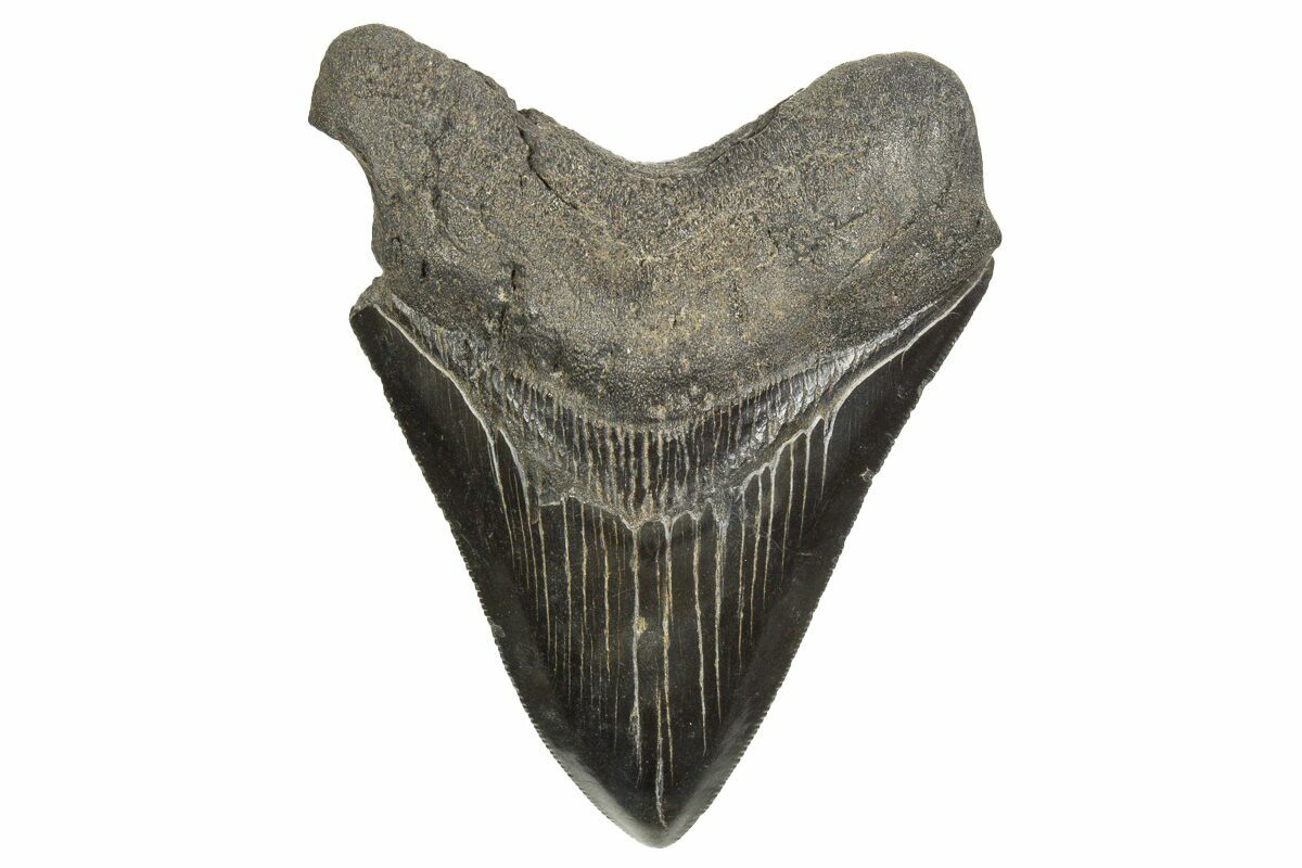 The standard measure for megalodon teeth is slant height, or the longest edge of the tooth. Adult megalodon teeth were typically in the 4 to 5 inch range: teeth over 6 inches are rare and represent super-sized individuals. Only a handful of teeth have ever been found over seven inches.
