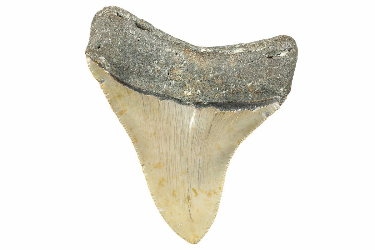 This is a serrated, 4.04" long Megalodon tooth collected on the North Carolina coast. It was found by commercial divers collecting "the ledges" in about 100 feet of water. It would have eroded out of the Pungo River Formation, putting its age in the range of 13.8 to 16 million years old. A tooth of this size would have come from a prehistoric, mega-shark in the 30+ foot size range.