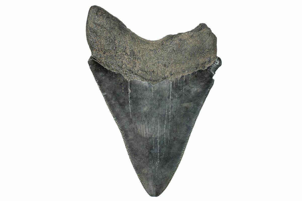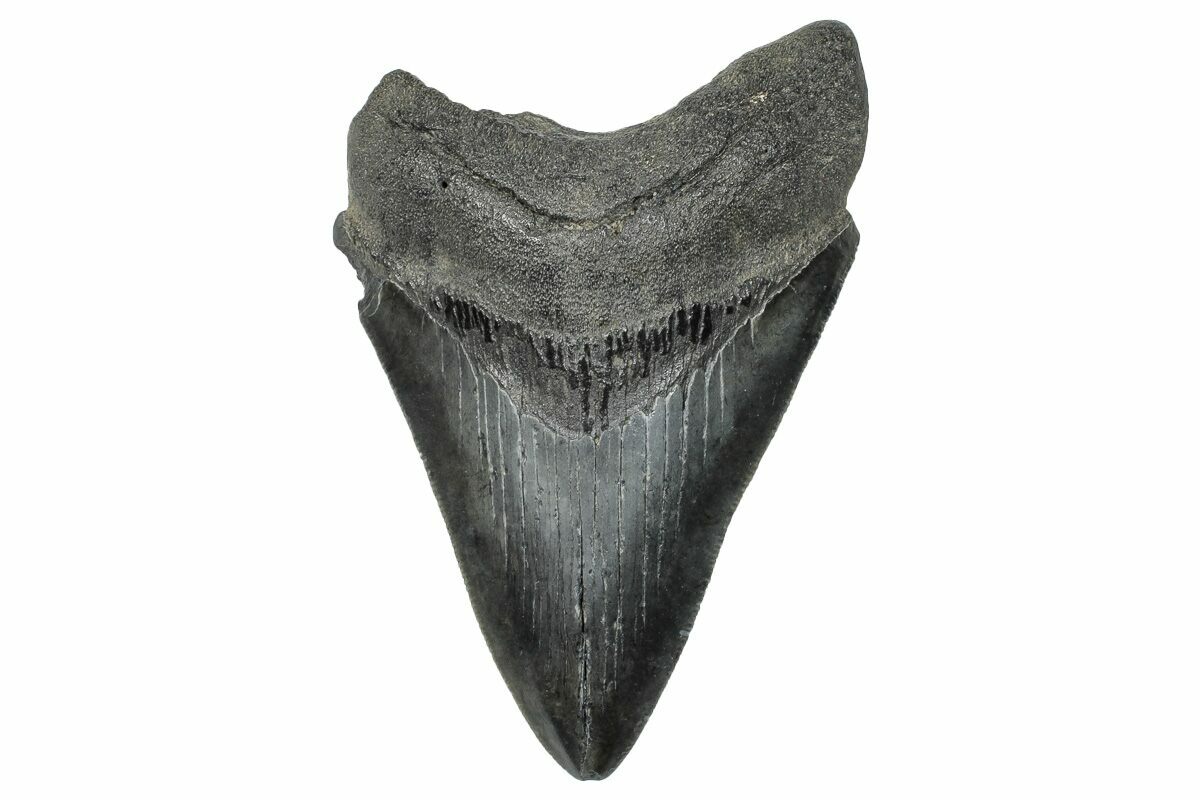 This is a serrated, 4.06" long, fossil Megalodon tooth collected in South Carolina. The tooth would have come from an adult, prehistoric, mega-shark in the 35+ foot size range.