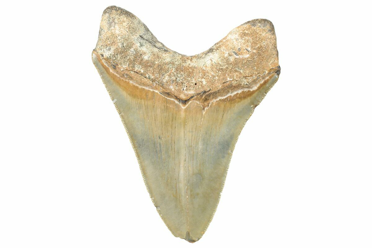 This is a serrated, 4.09" long Megalodon tooth collected on the North Carolina coast. It was found by commercial divers collecting "the ledges" in about 100 feet of water. It would have eroded out of the Pungo River Formation, putting its age in the range of 13.8 to 16 million years old. A tooth of this size would have come from a prehistoric, mega-shark in the 30+ foot size range.