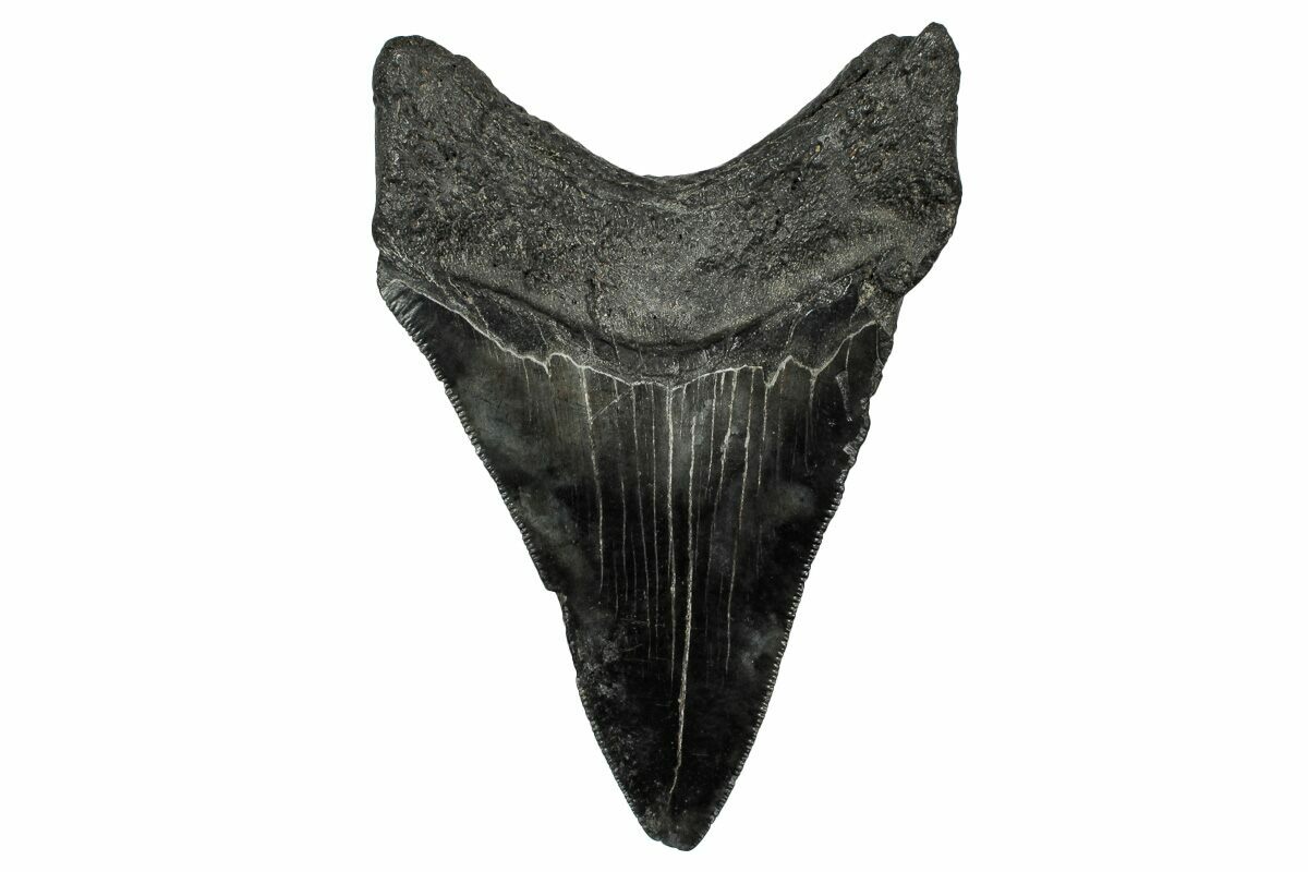 The standard measure for megalodon teeth is slant height, or the longest edge of the tooth. Adult megalodon teeth were typically in the 4 to 5 inch range: teeth over 6 inches are rare and represent super-sized individuals. Only a handful of teeth have ever been found over seven inches.