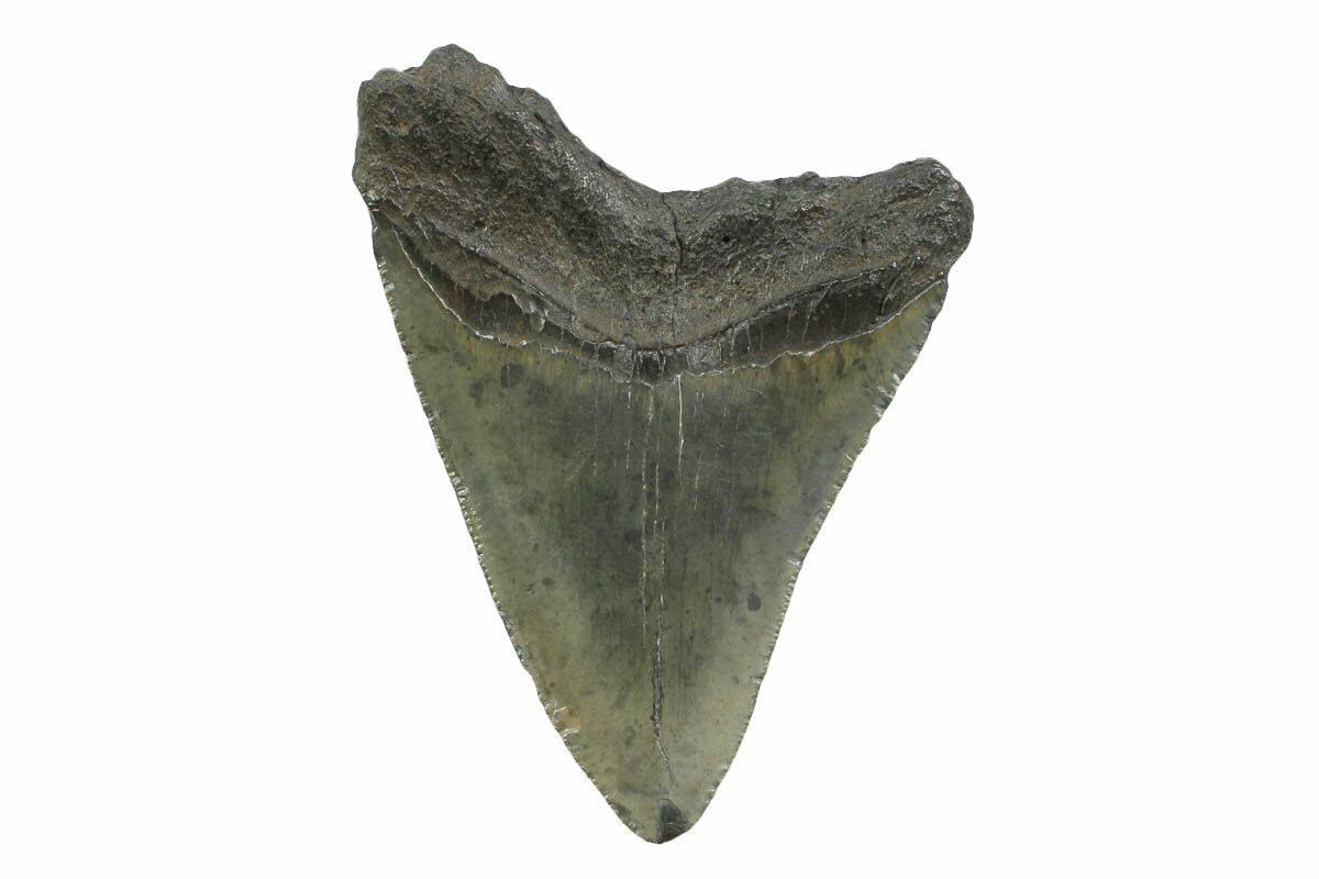 This is a 4.17" long, fossil megalodon tooth collected in South Carolina. The tooth would have come from an adult, prehistoric, mega-shark in the 35+ foot size range.