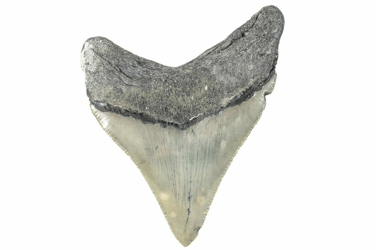 This is a serrated, 4.18" long Megalodon tooth collected on the North Carolina coast. It was found by commercial divers collecting "the ledges" in about 100 feet of water. It would have eroded out of the Pungo River Formation, putting its age in the range of 13.8 to 16 million years old. A tooth of this size would have come from a prehistoric, mega-shark in the 30+ foot size range.