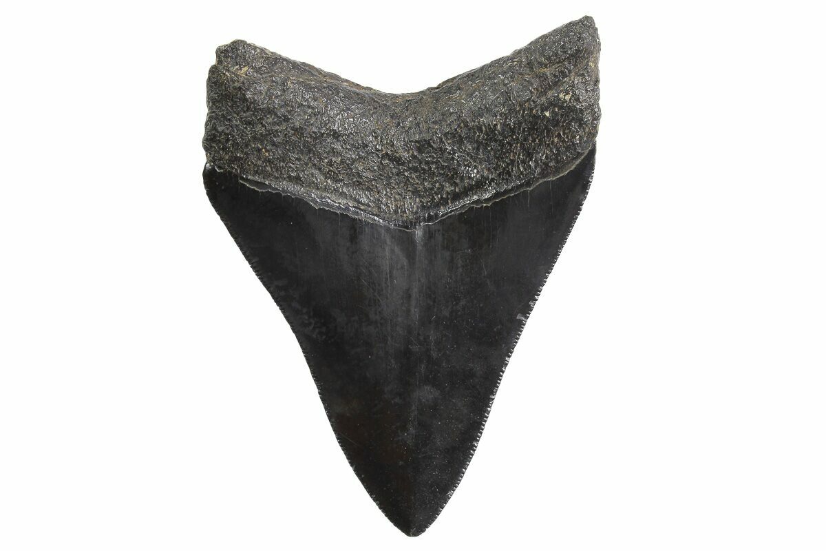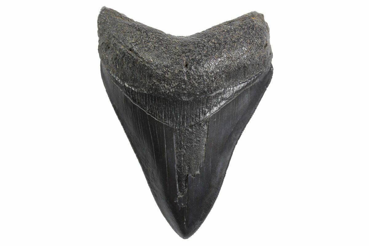 This is a serrated, 4.20" long fossil megalodon tooth collected in South Carolina. The tooth would have come from an adult, prehistoric, mega-shark in the 35+ foot size range.