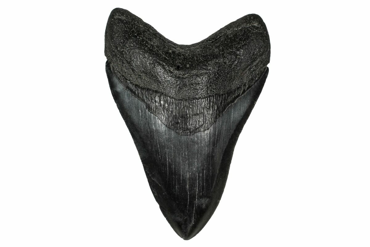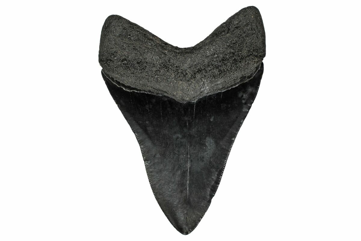 The standard measure for megalodon teeth is slant height, or the longest edge of the tooth. Adult megalodon teeth were typically in the 4 to 5 inch range: teeth over 6 inches are rare and represent super-sized individuals. Only a handful of teeth have ever been found over seven inches.