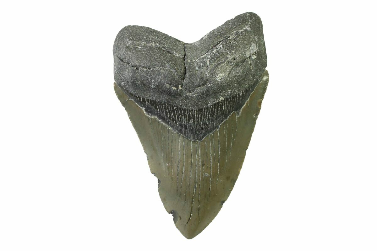 The standard measure for megalodon teeth is slant height, or the longest edge of the tooth. Adult megalodon teeth were typically in the 4 to 5 inch range: teeth over 6 inches are rare and represent super-sized individuals. Only a handful of teeth have ever been found over seven inches.
