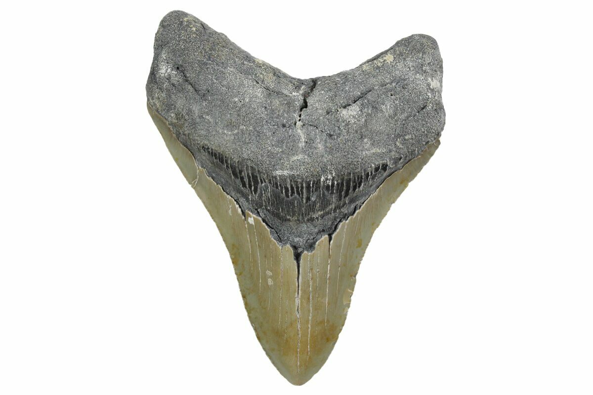 This is a serrated, 4.26" long megalodon tooth collected on the North Carolina coast. It was found by commercial divers collecting "the ledges" in about 100 feet of water. It would have eroded out of the Pungo River Formation, putting its age in the range of 13.8 to 16 million years old. A tooth of this size would have come from a prehistoric, mega-shark in the 35+ foot size range.
