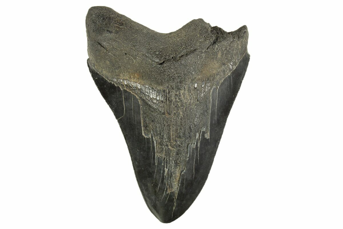 This is a serrated, 4.41" long fossil megalodon tooth collected in South Carolina. A tooth of this size would have come from a prehistoric mega-shark in the 35+ foot size range.